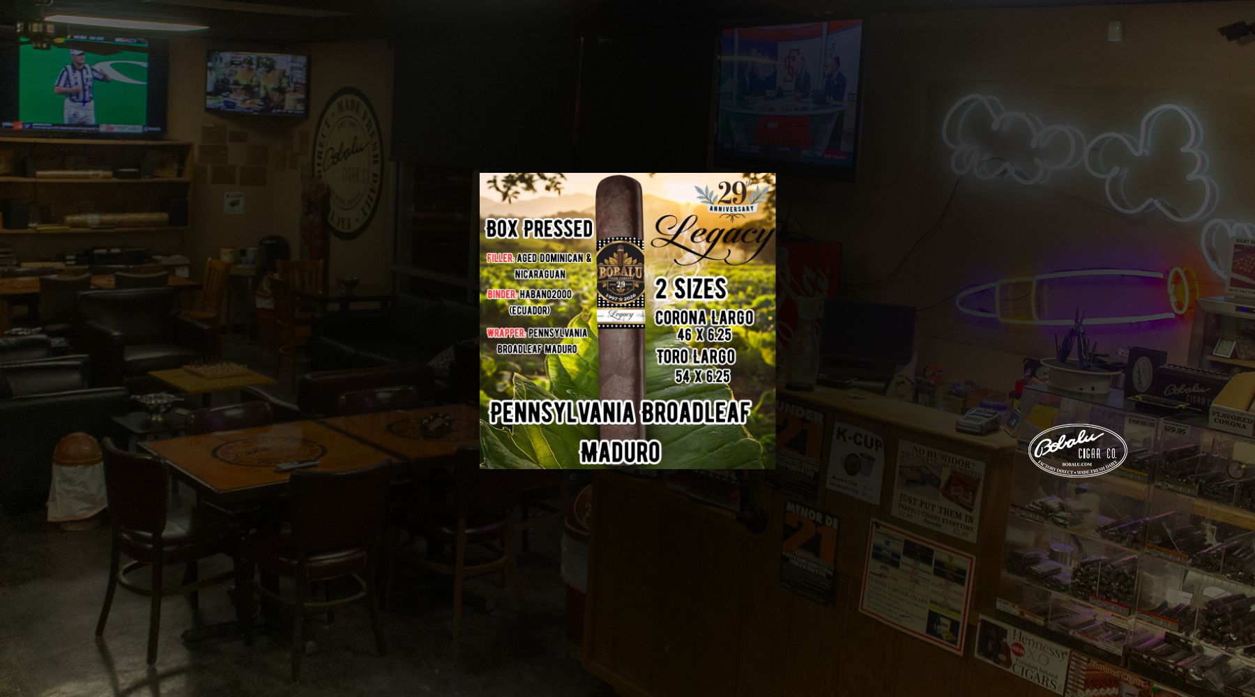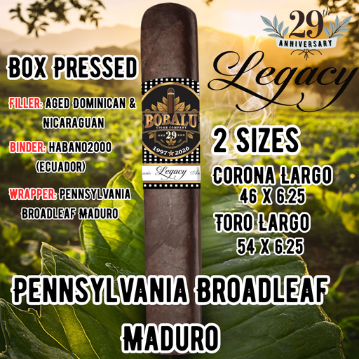 Built to celebrate 29 years of craftsmanship, the Bobalu Legacy delivers bold flavor wrapped in a dark, oily Pennsylvania Broadleaf Maduro. This bo...